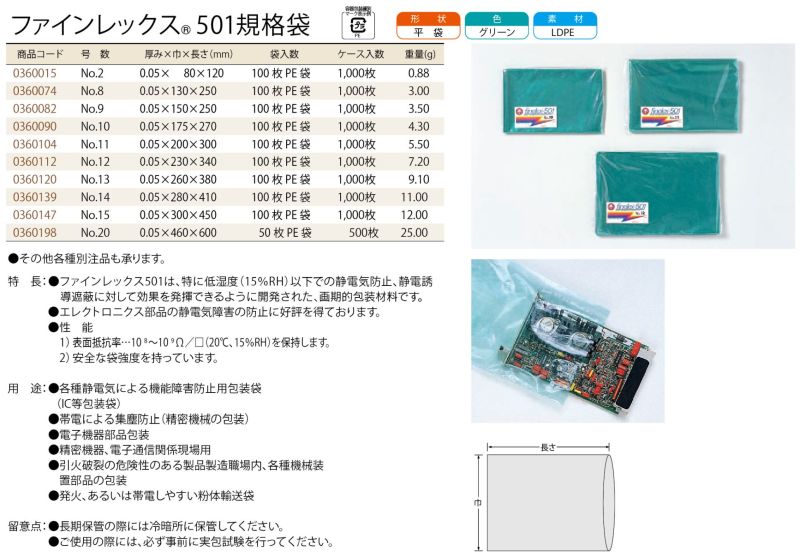 ファインレックス501規格袋は、特に低湿度での静電気防止に対して効果を発揮します。長期保管の際には冷暗所に保管してください。