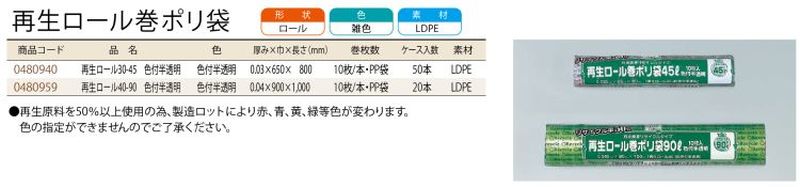 再生ロール巻ポリ袋 再生ロール40-90 色付半透明