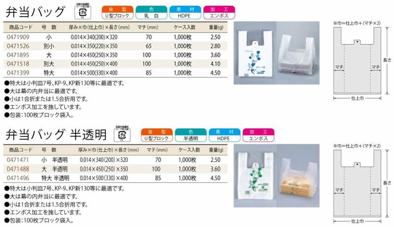 弁当バッグは、特大は小判皿7号・KP-9・KP新130等に、大は幕の内弁当に最適です。小は1合折または1.5合折用です。エンボス加工を施した手提げレジ袋です。