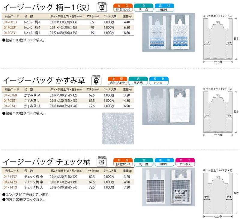 イージーバッグに柄が印刷された、手提げのレジ袋です。チェック柄はエンボス加工を施しています。