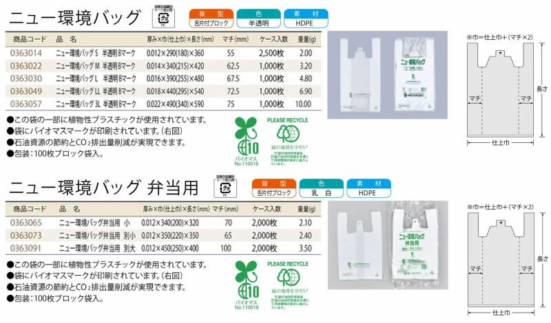 ニュー環境バッグは、一部に植物性プラスチックが使用されており、袋にバイオマスマークが印刷されています。石油資源の節約とCO2削減が実現した手提げのレジ袋です。