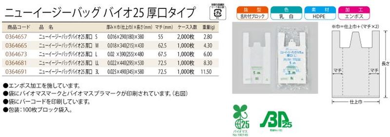 ニューイージーバッグバイオ25厚口タイプは、エンボス加工を施しています。袋にバイオマスマークとバイオマスプラマーク、バーコードが印刷されています。石油資源の節約と石油資源の節約とCO2削減が実現。