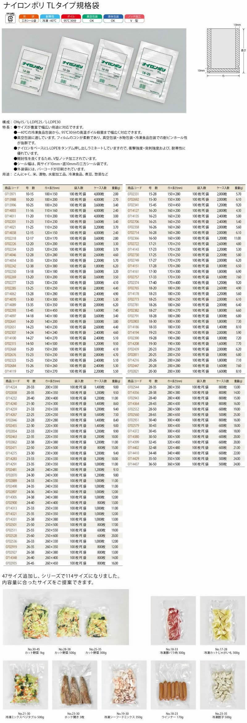 ナイロンポリ TLタイプ規格袋はサイズが豊富で-40℃の冷凍食品包装から95℃30分の高温ボイル殺菌まで幅広い用途に対応できます。