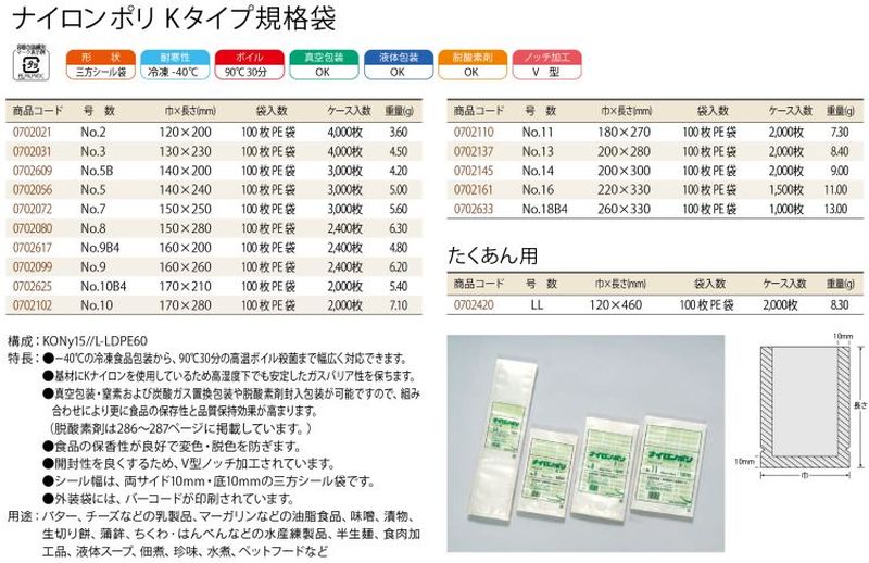 ナイロンポリ Kタイプ規格袋は-40℃の冷凍食品包装から90℃30分の高温ボイル殺菌まで幅広い用途に対応できます。