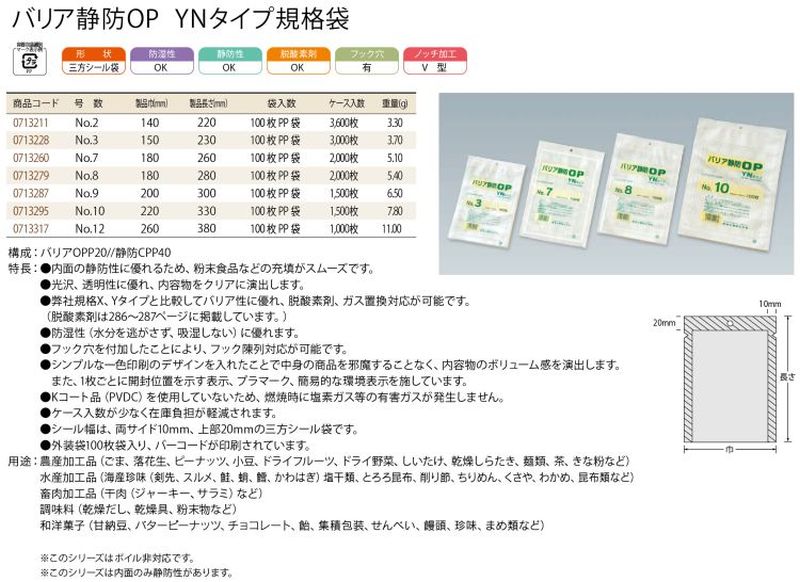 バリア静防OP YNタイプ規格袋は内面の静防性に優れるため、粉末食品などの充填がスムーズです。
