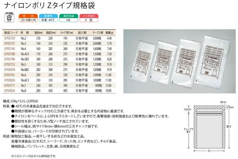 ナイロンポリ Zタイプ規格袋は-40℃の冷凍食品包装まで対応できます。