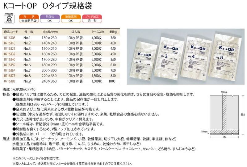 KコートOP Oタイプ規格袋は酸素バリア性に優れるため、カビの発生・油脂の酸化による品質の劣化を防ぎ、さらに食品の変色、脱色も抑制します。