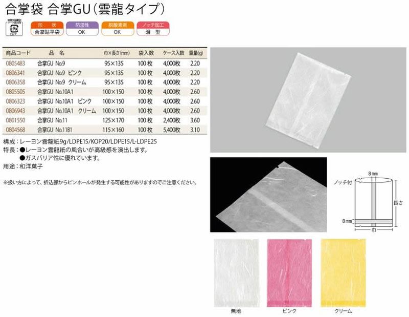 合掌袋 合掌GU(雲龍タイプ)はレーヨン雲龍紙の風合いが高級感を演出します。脱酸素剤対応で食品の保存性が高まります。