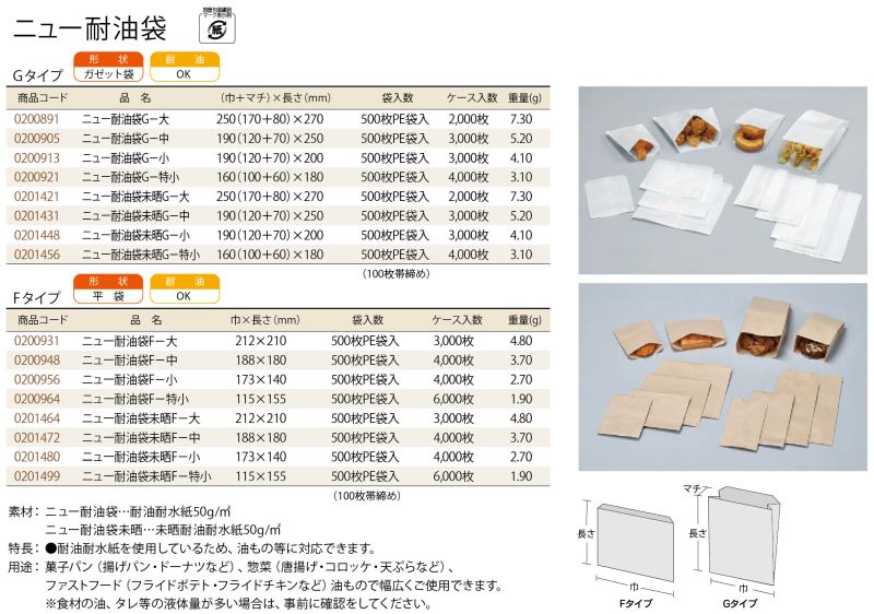 Gタイプ(ガゼット袋)とFタイプ(平袋)があります。菓子パン、総菜、ファストフードなど、油もので幅広くご使用できます。