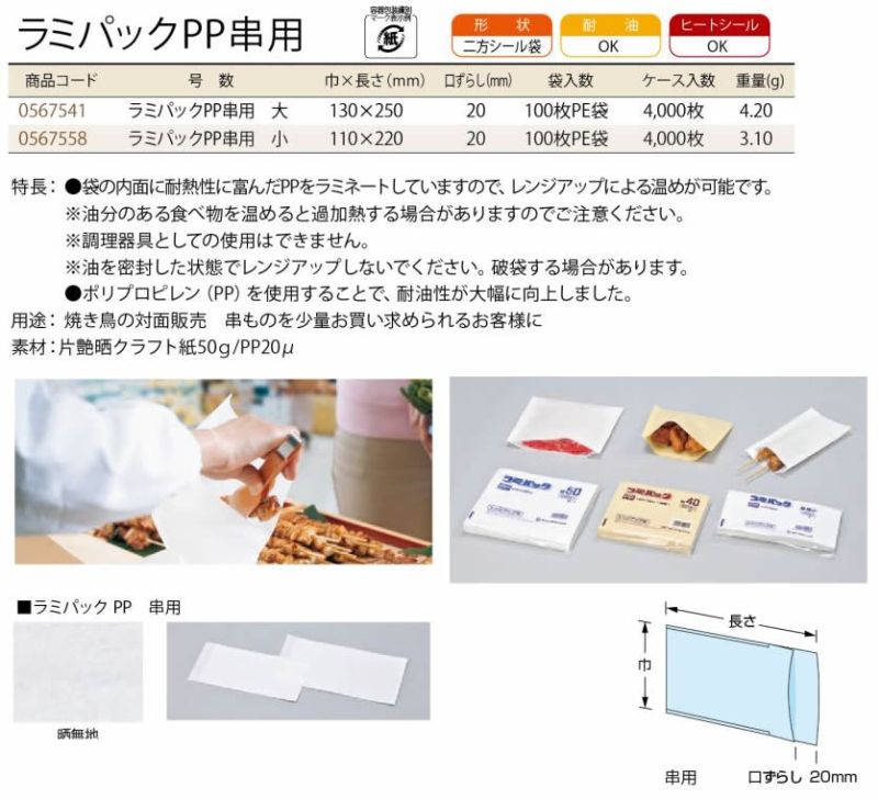 ラミパックPP串用は袋の内面に耐熱性に富んだポリプロピレン(PP)をラミネートしていますので、耐油性が大幅に向上し、130℃のレンジアップが可能です。
