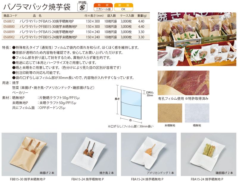 パノラマパック焼芋袋は特殊有孔フィルムで袋内の蒸れを和らげ、ほくほく感を維持します。