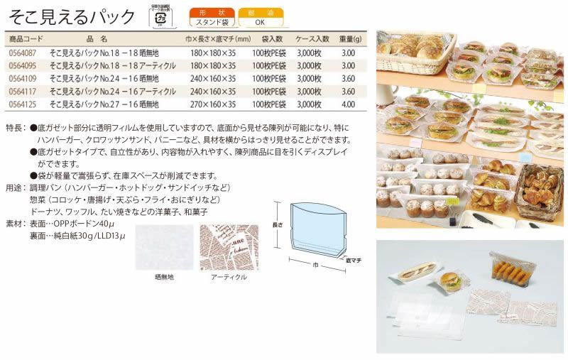 そこ見えるパックは底ガゼット部分に透明フィルムを使用していますので、底面から見せる陳列が可能になり、特にハンバーガー・クロワッサンサンド・バニーニなど、具材を横からはっきり見せることができます。