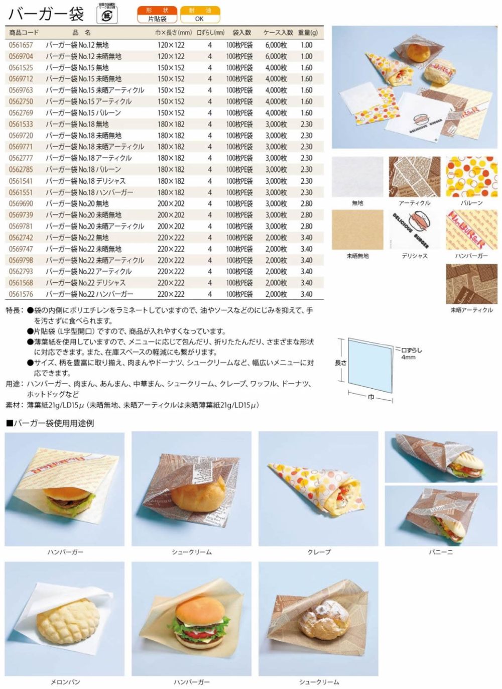 バーガー袋は袋の内側にポリエチレンをラミネートしていますので油やソースなどのにじみを抑えて、手を汚さずに食べられます。