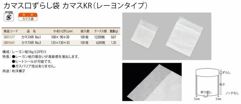 カマスKR 口ずらし袋(レーヨンタイプ)はレーヨン紙の風合いが高級感を演出します。ヒートシールが可能で、和洋菓子に適しています。