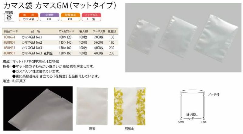 Uノッチ加工がされており、脱酸素剤、乾燥剤対応です。