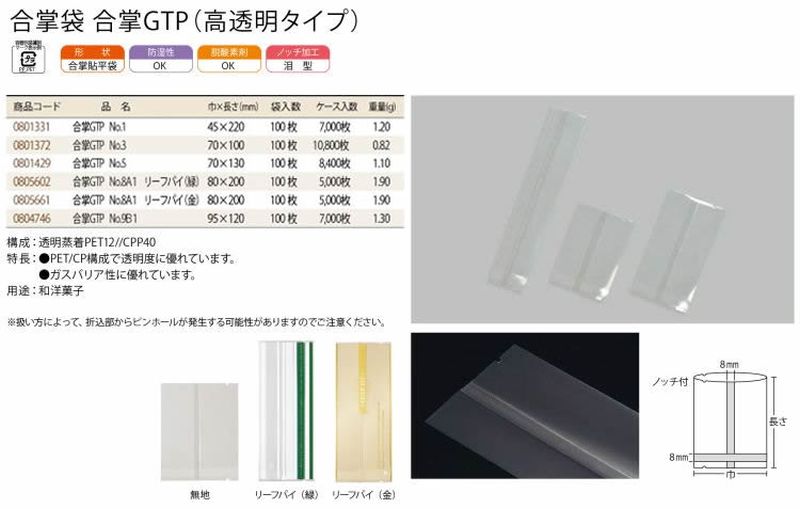 合掌袋GTP(高透明タイプ)は定番のカマス形状で、厚みの無いお菓子をピタッと包みます。