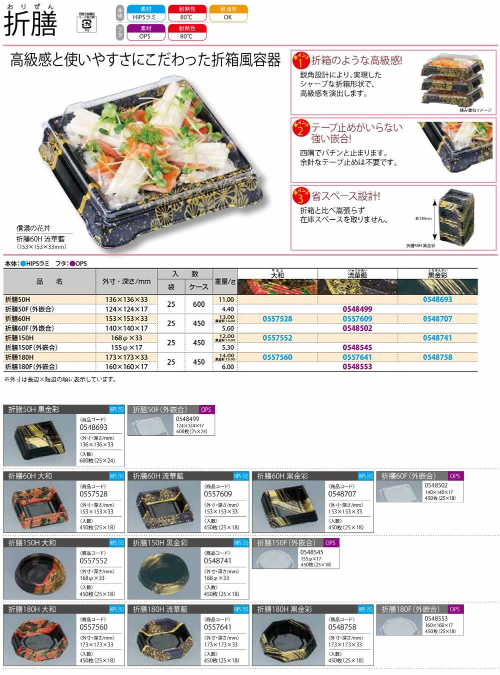 折膳は、高級感と使いやすさにこだわった折箱風容器です。鋭角設計により、実現したシャープな折箱形状は高級感を演出可能です。