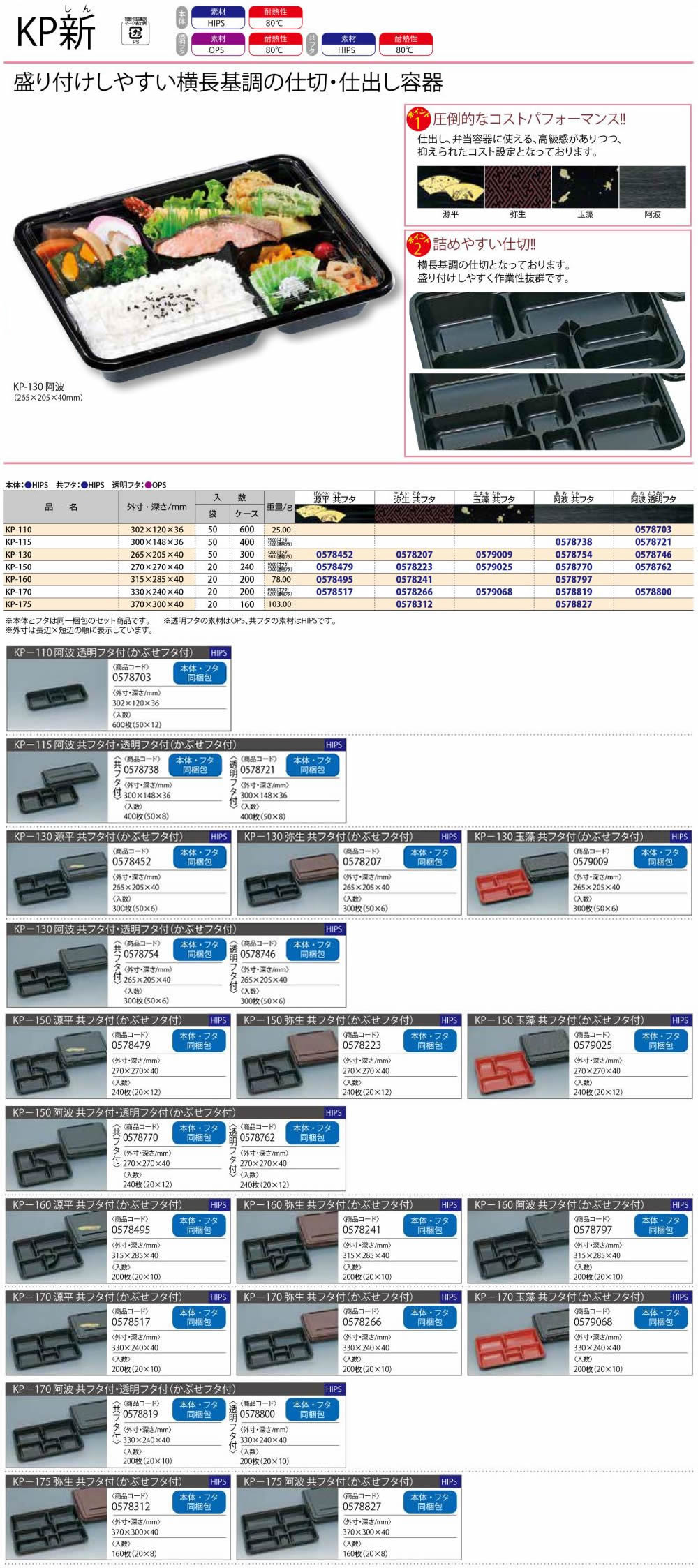 KP新は、隙間の発生をなくし盛り付けやすくした横長基調の仕切が特徴の仕出し容器です。
