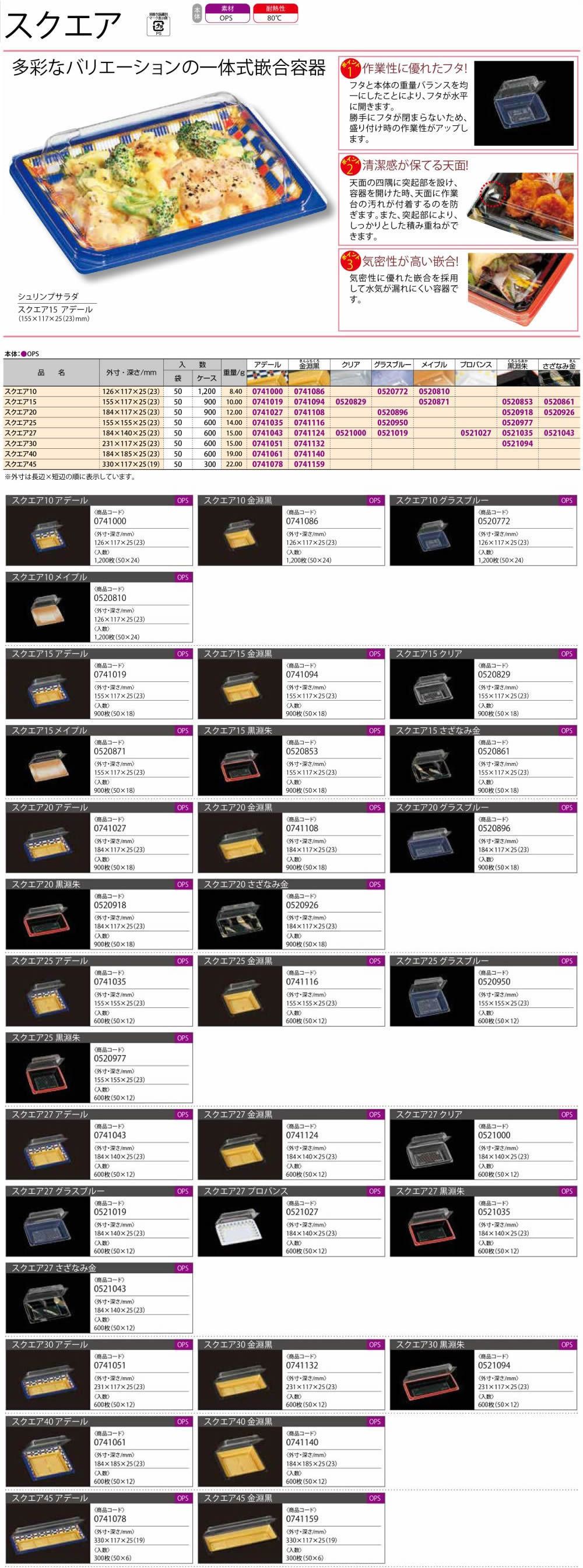 スクエアは、多彩なメニューに対応するバリエーション豊かな一体式嵌合容器です。フタと本体の重量バランスを均一にしたことにより、フタが水平に開きます。