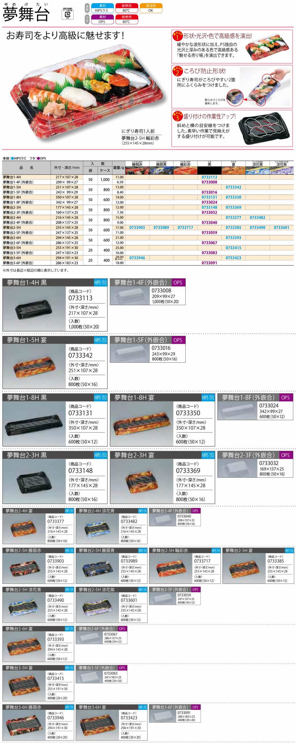 夢舞台は、お寿司をより高級に魅せます。斜めに目安線があり、誰でも素早い作業で見映えのする盛り付けが可能な寿司容器です。