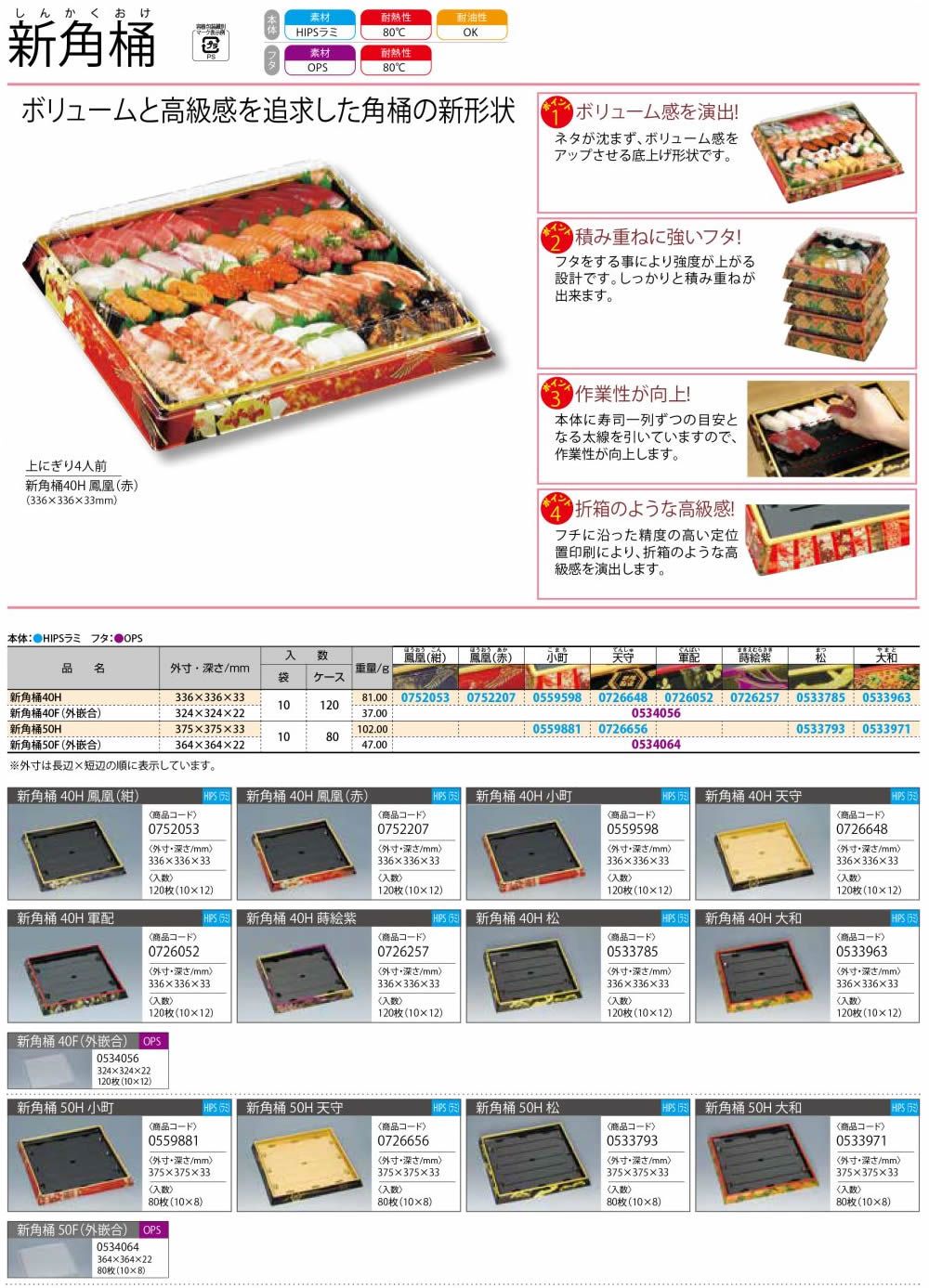 新角桶はネタが沈まず、ボリューム感をアップする底上げ形状の角桶です。フタをする事により強度が上がり、しっかりと積み重ねが出来ます。