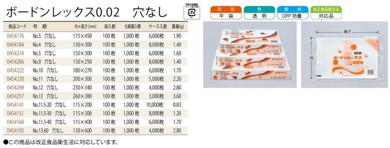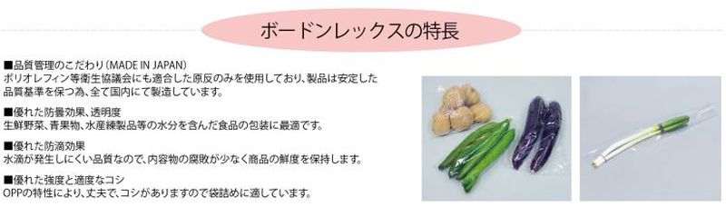 ボードンレックスは、優れた防曇効果、防滴効果、透明度があります。水滴が発生しにくい品質なので、生鮮野菜、青果物、水産練製品等の水分を含んだ食品の鮮度を保持するので包装に最適です。